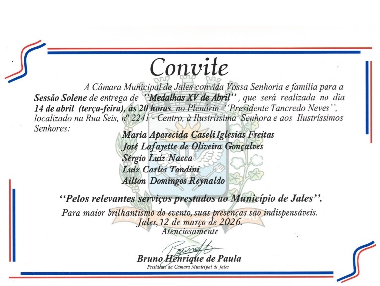 Os interessados podem obter mais informações sobre a “Medalha XV de Abril” pelo endereço www.jales.sp.leg.br/titulos-e-medalhas.